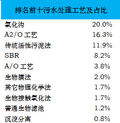據不完全統計,全國范圍內已建成運營的污水處理廠數量約4000座,這其中有統計數據的污水處理工藝大約30種左右,E20研究院統計各類技術工藝,排名如下文所示: